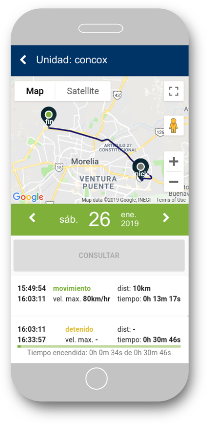 Muestra los recorridos del vehículo, distancia recorrida de punto a punto, tiempo que estuvo encendido el motor, velocidades, estado del motor (Encendido o Apagado) y tiempos de recorridos.